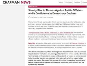https://news.chapman.edu/2024/06/07/steady-rise-in-threats-against-public-officials-while-confidence-in-democracy-declines/